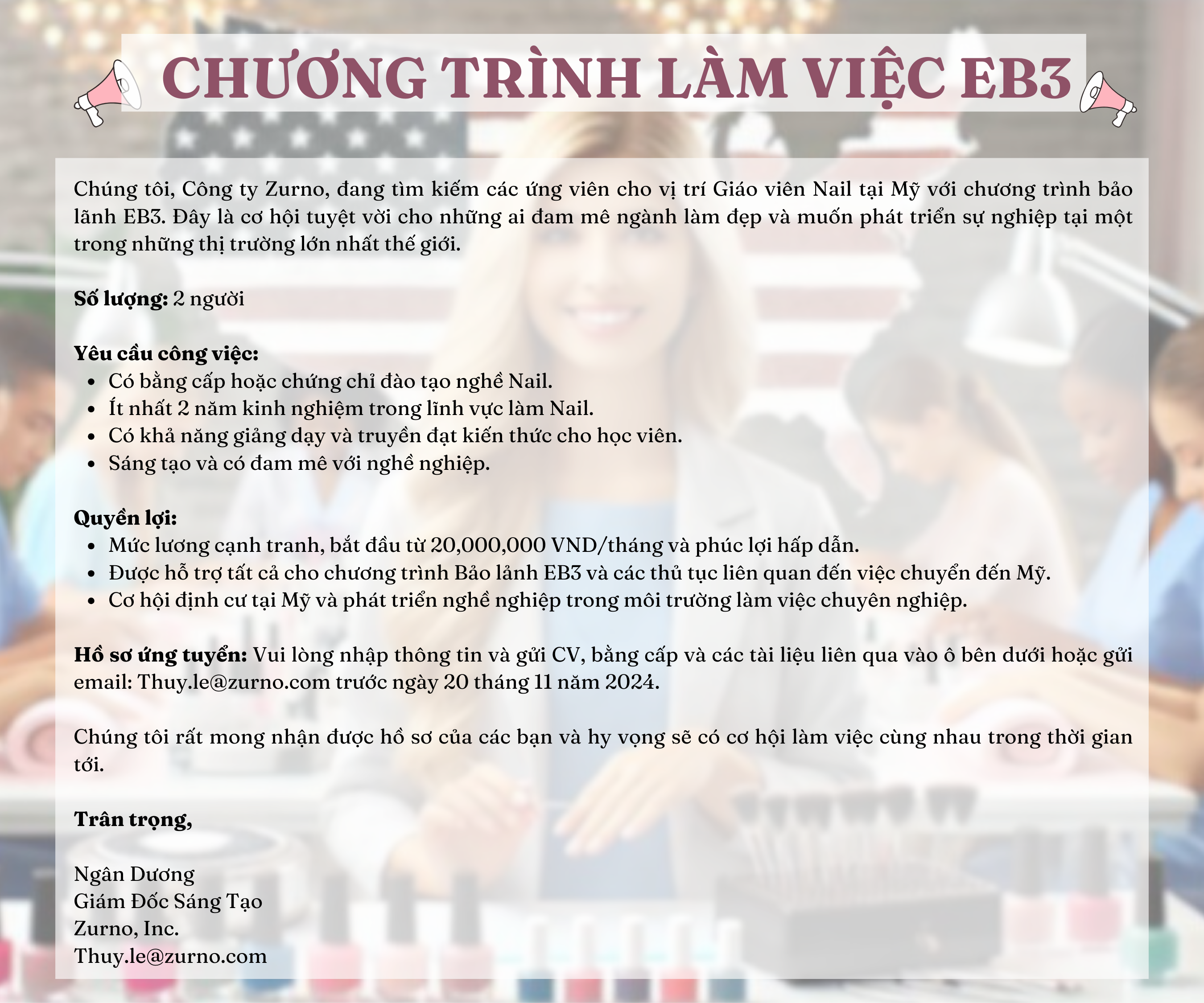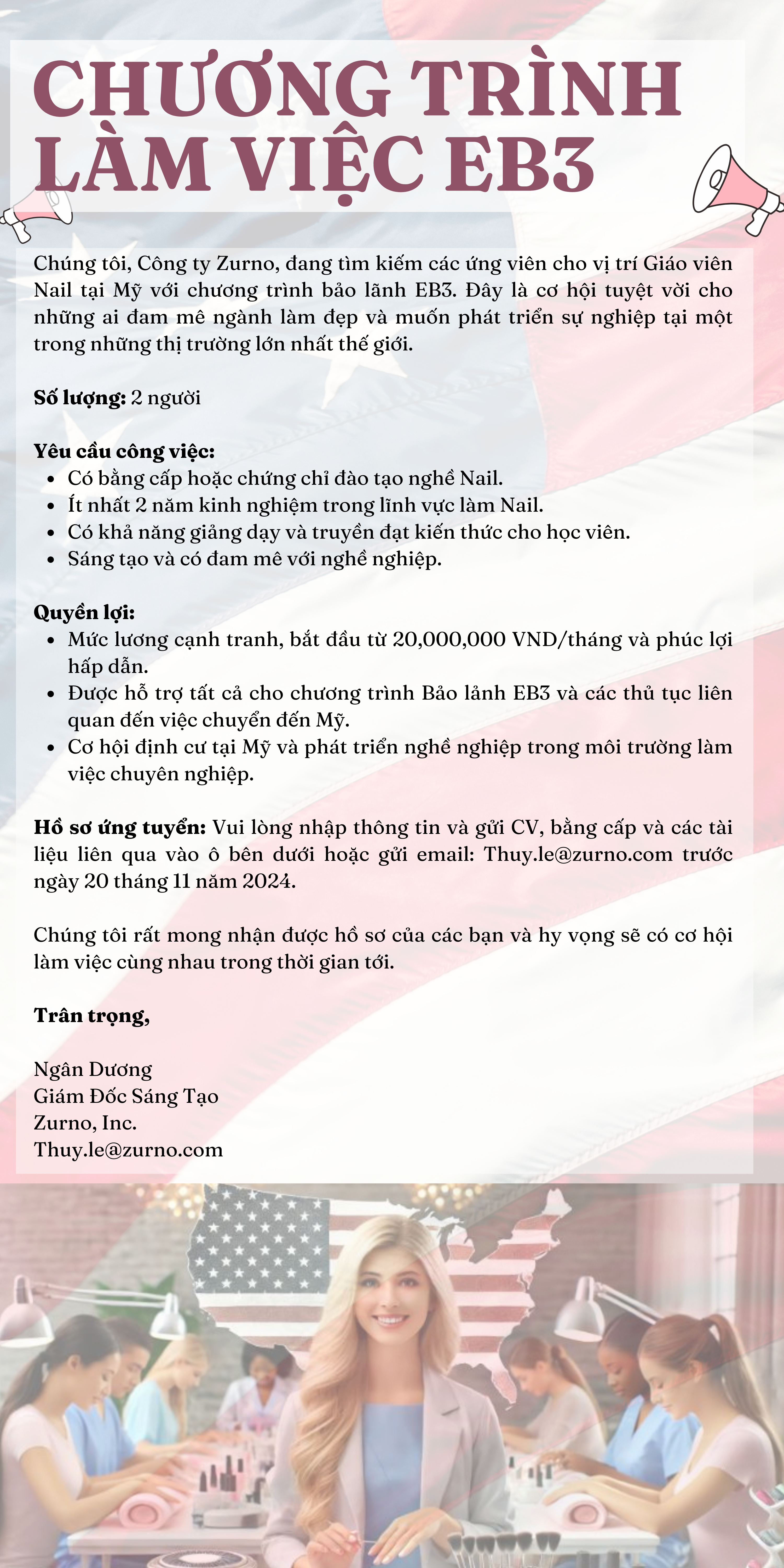 Nail Academy Instructors: Teach various nail classes from beginner to advanced levels and from continuing education to certified license program in manicure, pedicure, nail filing techniques, art nail design, nail product applications, nail care and anatomy, advanced nail techniques, and salon operation procedures. 2 years of Nail Technician or Nail Instructor/Educator experience. Up to 50% domestic and international travel required. Mail resumes to Attn: Human Resources, Zurno, Inc., 10055 Seminole Blvd, Seminole, FL 33772. Refer to NTT when applying.